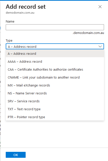 Name: The name of your record. i.e. “shop” will result in a record for “shop.demodomain.com.au”