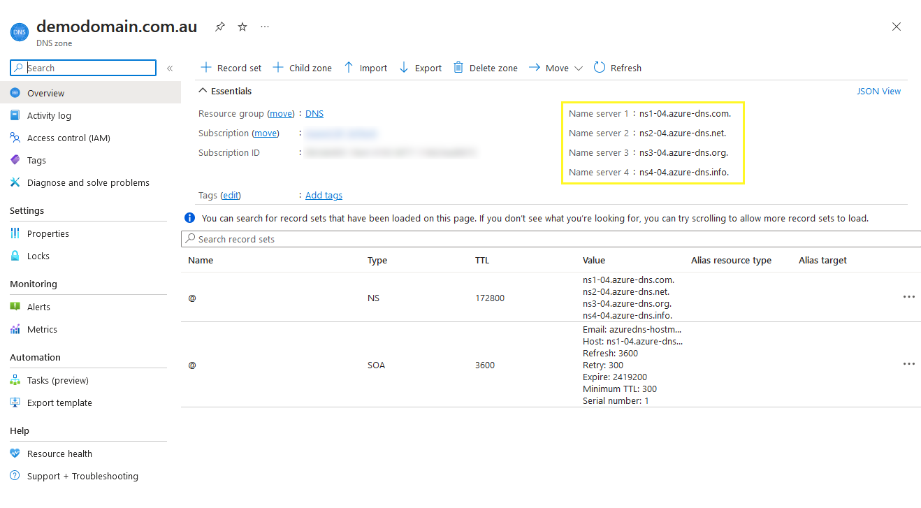 Probably the most important part about this DNS zone at this stage is the 4 Name server records at the top right of the Essentials area (highlighted by the yellow box above).