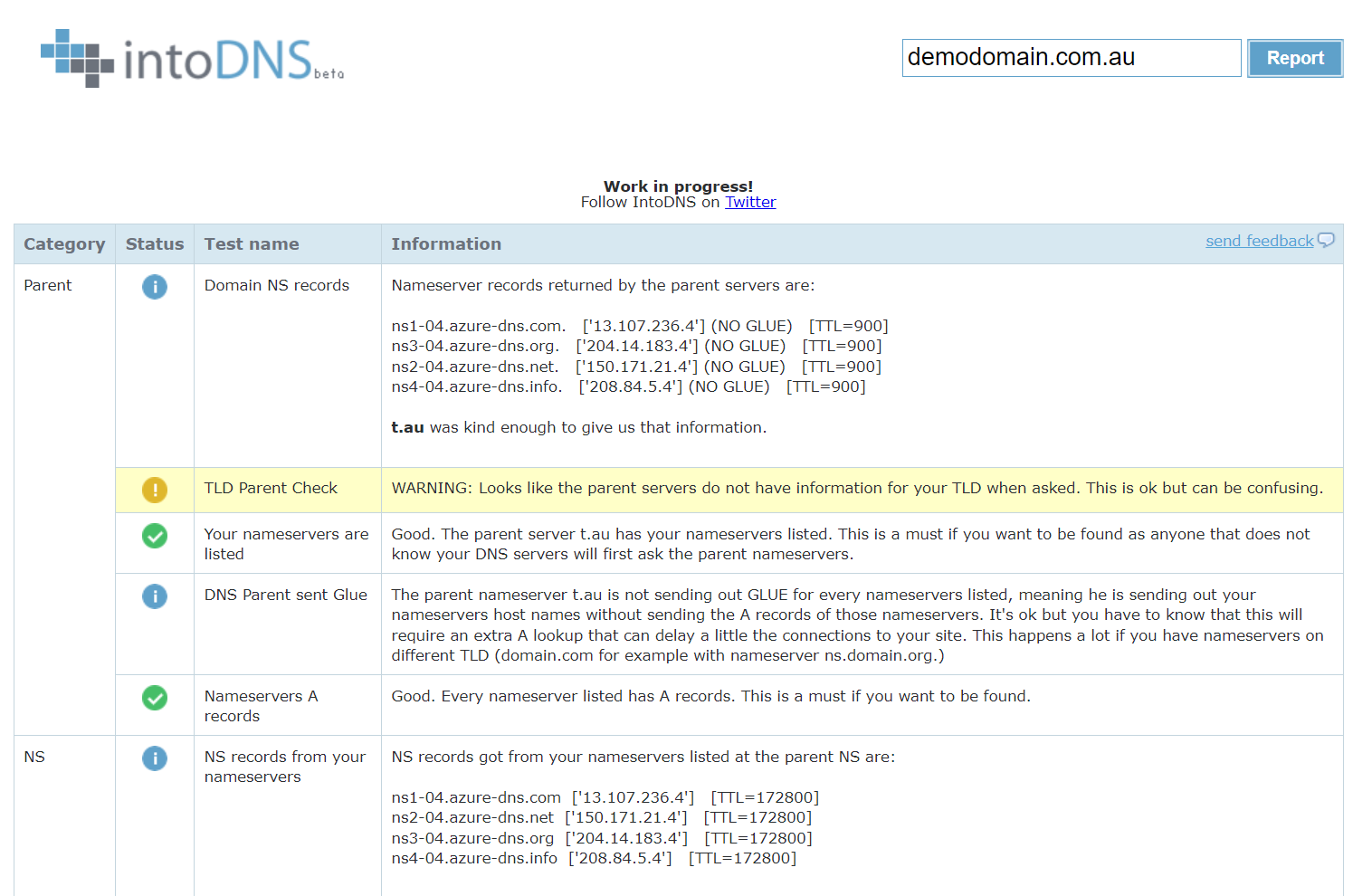 I use a neat little website called IntoDNS. If you visit IntoDNS, enter your domain and click Report, you will get a neat little report that lists at the very top what your active nameservers are. As you see, the listed nameservers match what Azure shows in the yellow box, so our domain is looking at these records.