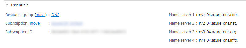 Once your DNS zone is created, you will see a default set of records that include the NS and SOA records. You typically won’t need to know much about these records, or ever edit them. The nameservers that Azure have allocated to your DNS zone record will be shown in the Essentials section of the page. These should be the nameservers that you add to your domain registration record with your domain registrar.