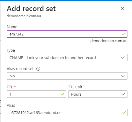 Enter the corresponding value from the SendGrid DNS record into the Alias field for the new DNS record