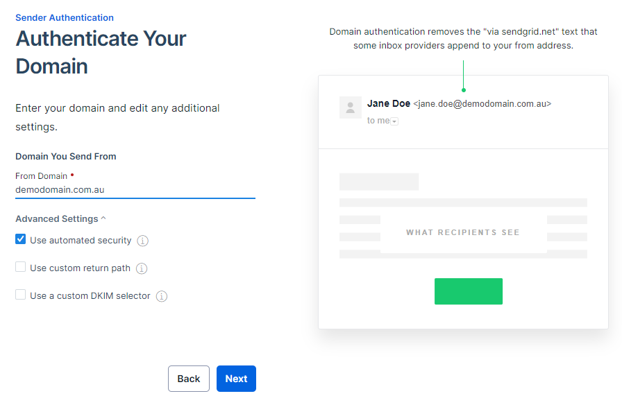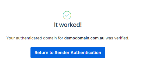 The following page asks you to enter the domain you wish to authenticate. In this example, we’re using demodomain.com.au.