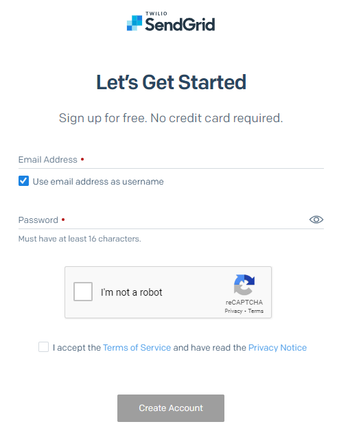 To get an account set up, head over to https://signup.sendgrid.com/ to create your account.