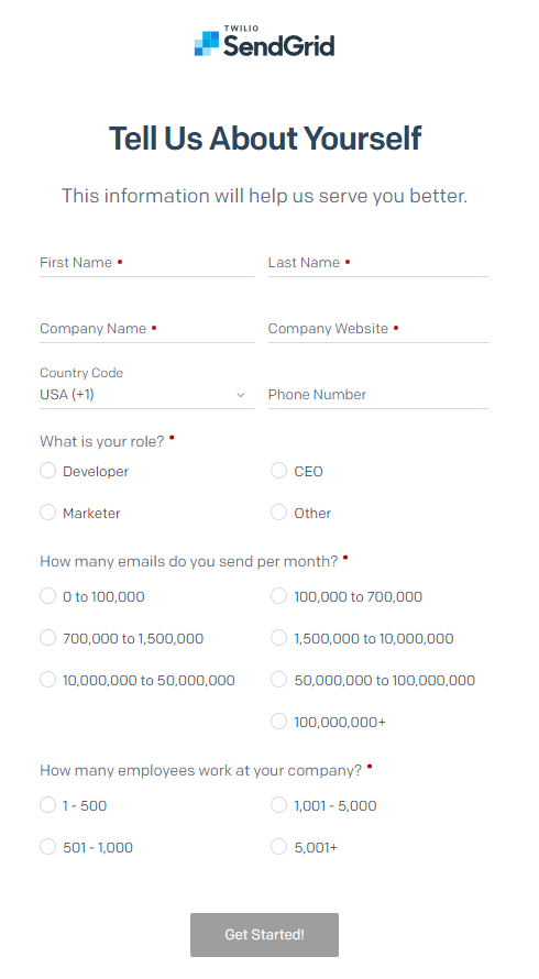 Enter your email address and a SECURE password, and accept the terms of service and the privacy policy. You’ll then be sent to a “Tell us about yourself” page to enter some additional information.